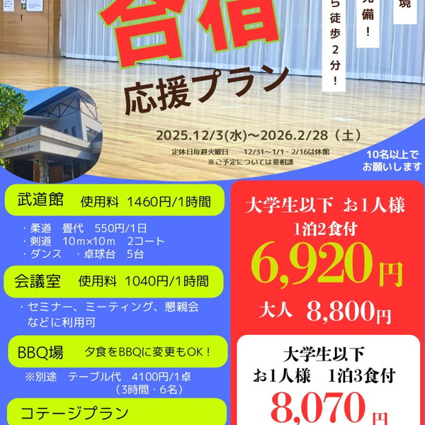 テニスコート、武道館、フットサル場などのスポーツ施設の他、農林業体験や宿泊、入浴施設を備えた複合レジャー施設です。